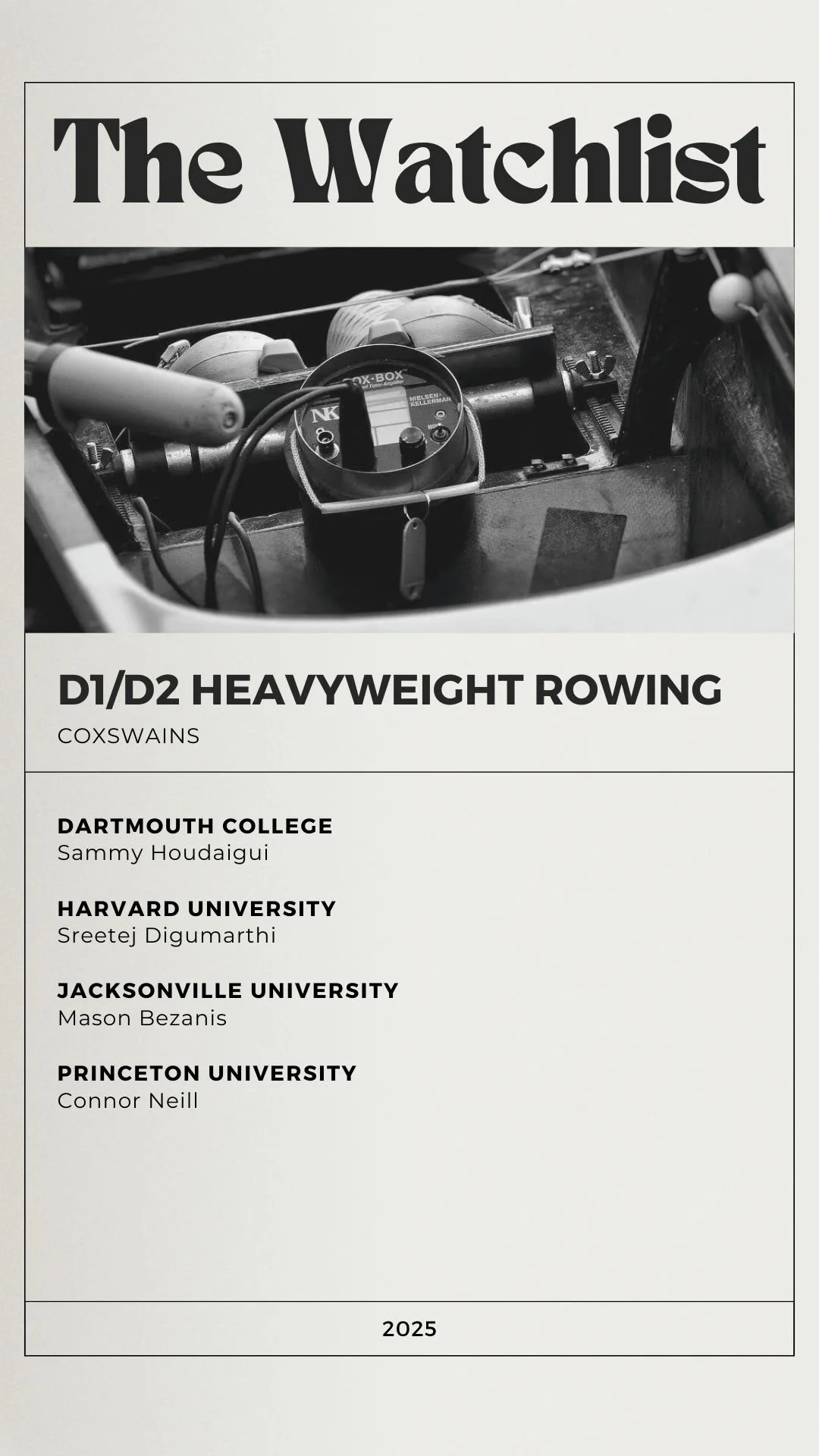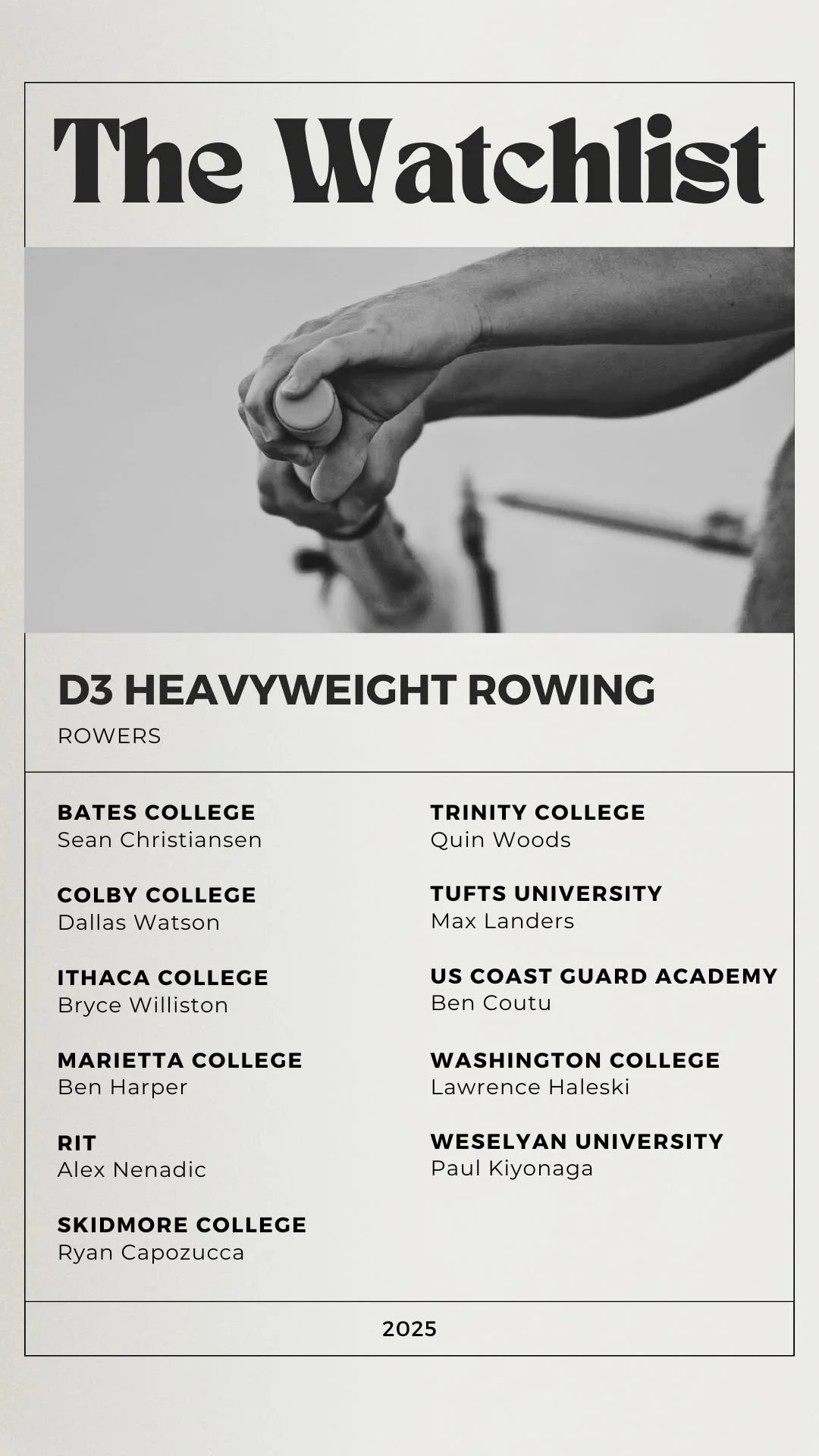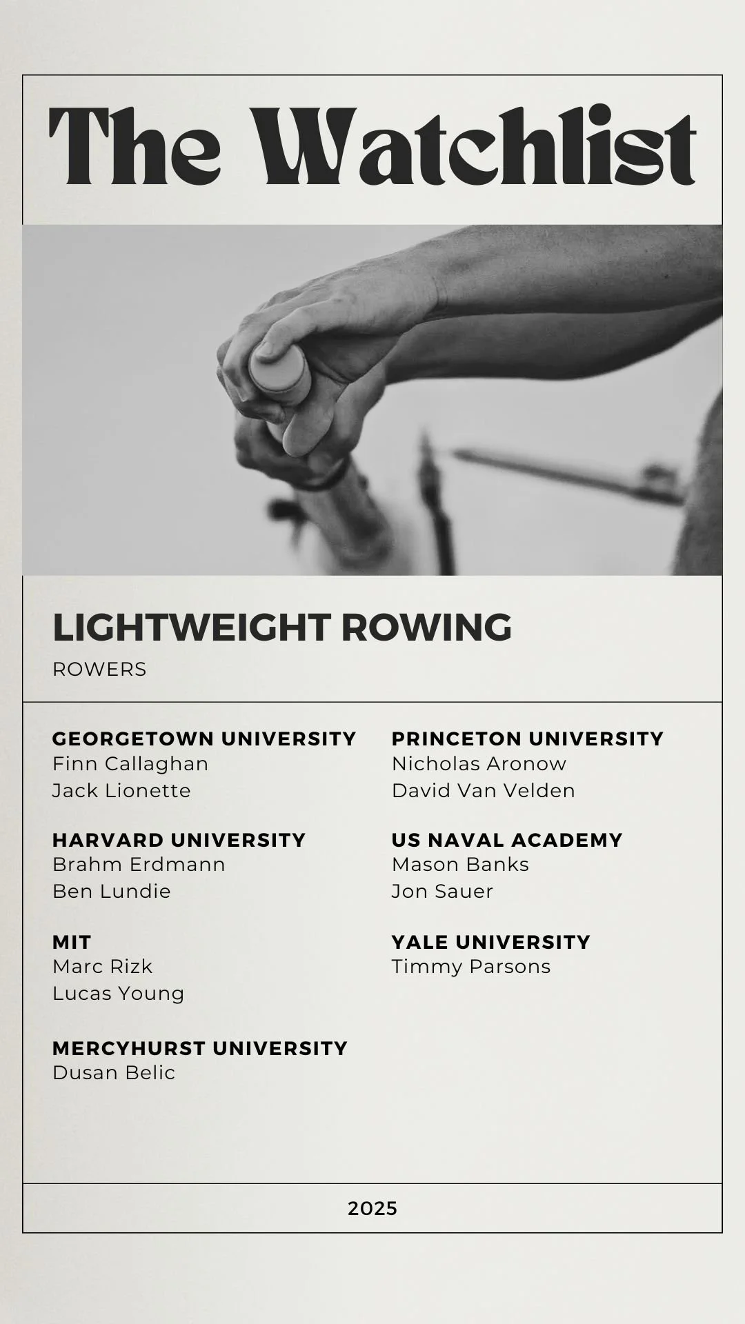 From the 6 Olympians, 21 team captains, 16 U23 team members, and 2 Henley Royal Regatta winners to the future national team members, team captains, and breakout rowers and coxswains from all three divisions, these men and women are valued leaders at their institutions, trail blazers within their programs, and set the standard for performance and sportsmanship in D1/D2, D3, and lightweight men’s rowing.