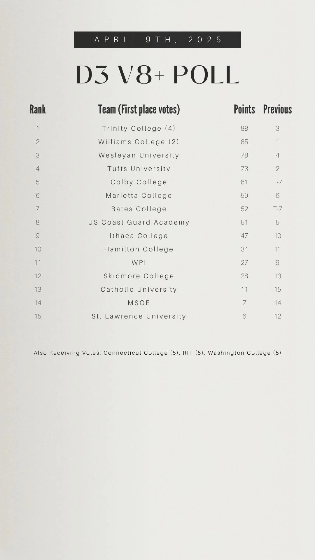 Today the Awards & Polling Committee released the 2025 Week 1 IRCA/IRA Coaches Poll, which ranks the Top 25 D1/D2 varsity 8+s, the Top 15 D3 varsity 8+s, and all varsity lightweight programs' top boat . The regular season poll will be released weekly on Wednesdays through the end of the season and can be found here under the “news” tab, on row2k, and on our Instagram. Past polls are saved as “highlights” on IG.