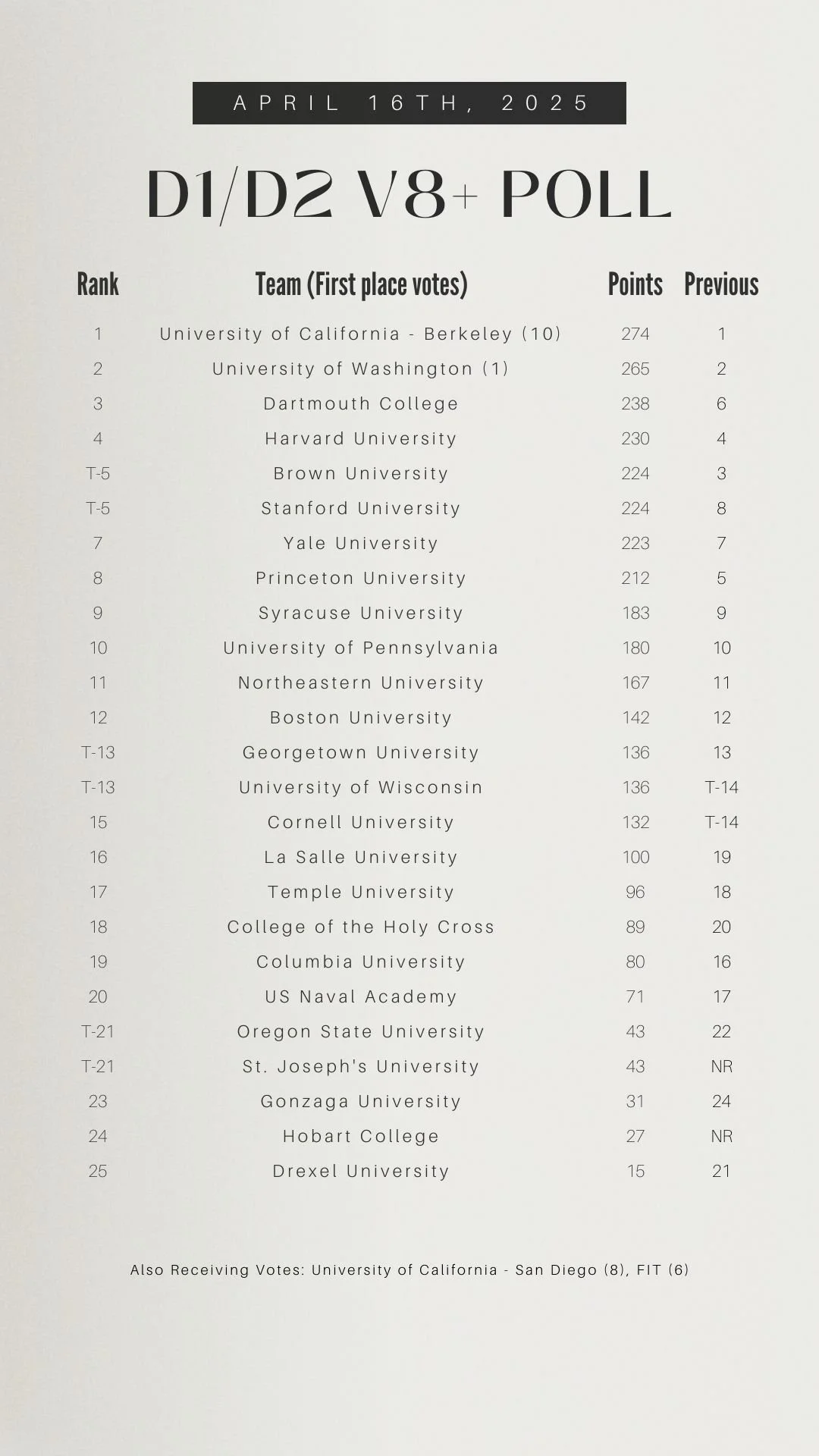 Today the Awards & Polling Committee released the 2025 Week 2 IRCA/IRA Coaches Poll, which ranks the Top 25 D1/D2 varsity 8+s, the Top 15 D3 varsity 8+s, and all varsity lightweight programs' top boat . The regular season poll will be released weekly on Wednesdays through the end of the season and can be found here under the “news” tab, on row2k, and on our Instagram. Past polls are saved as “highlights” on IG.