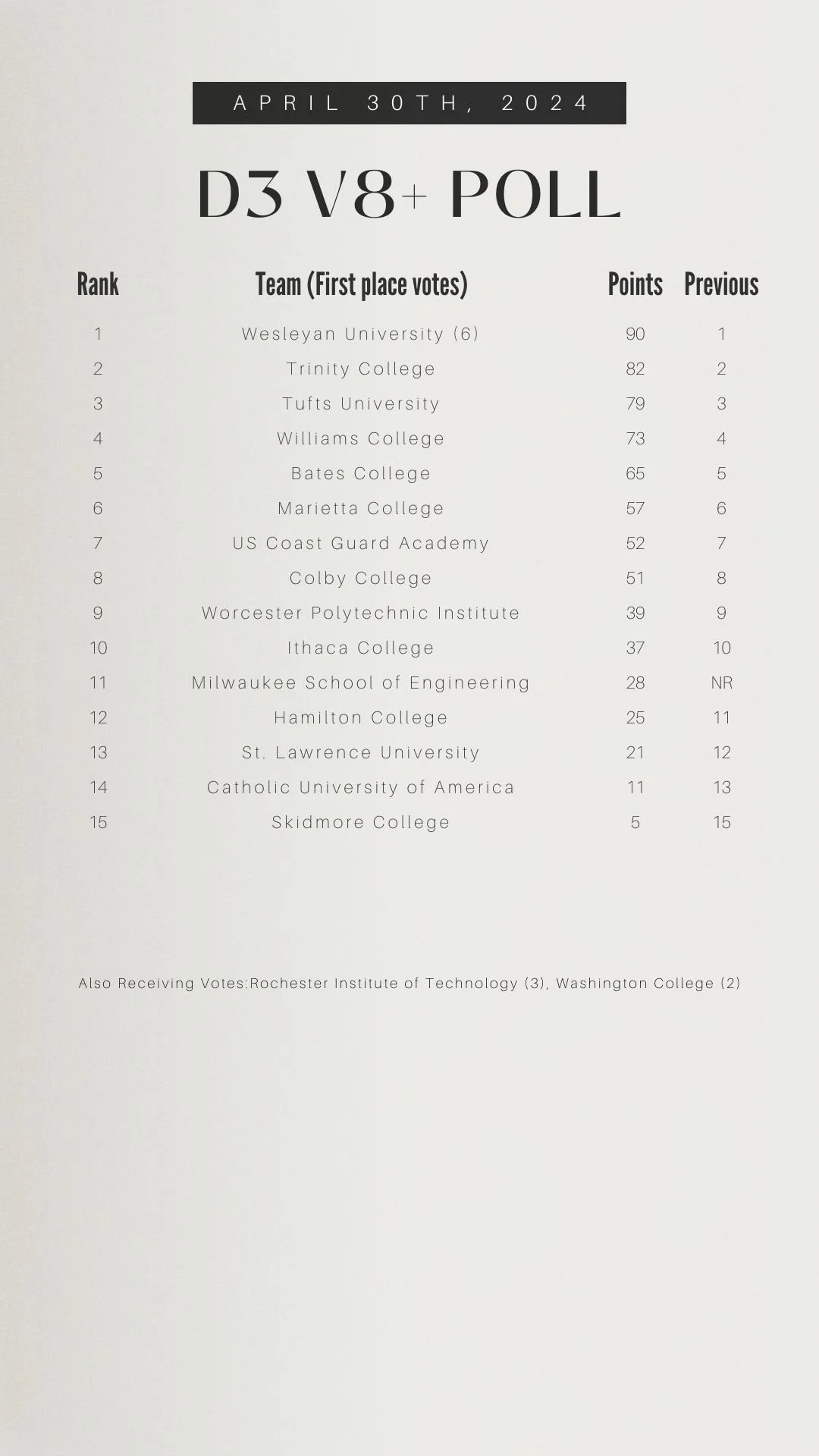 In addition to the varsity 8+ rankings for all divisions, polls this week also include rankings for the D1/D2 2nd and 3rd varsity 8+s, Ten Eyck team points, D3 2nd varsity 8+s, D3 team points, Lightweight 2nd varsity 8+s, and Lightweight team points.