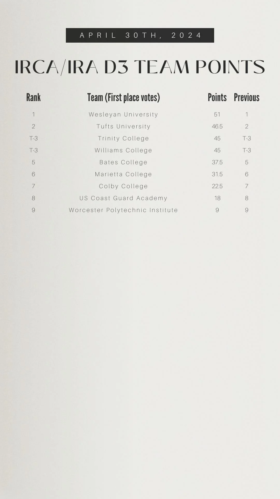 Polls for the 2024 Spring Season will be operated under a joint agreement between the IRCA and the IRA. There will not be separate polls as there have been in past years. Everything else remains the same with regards to seeding determinations at the conclusion of the regular season.