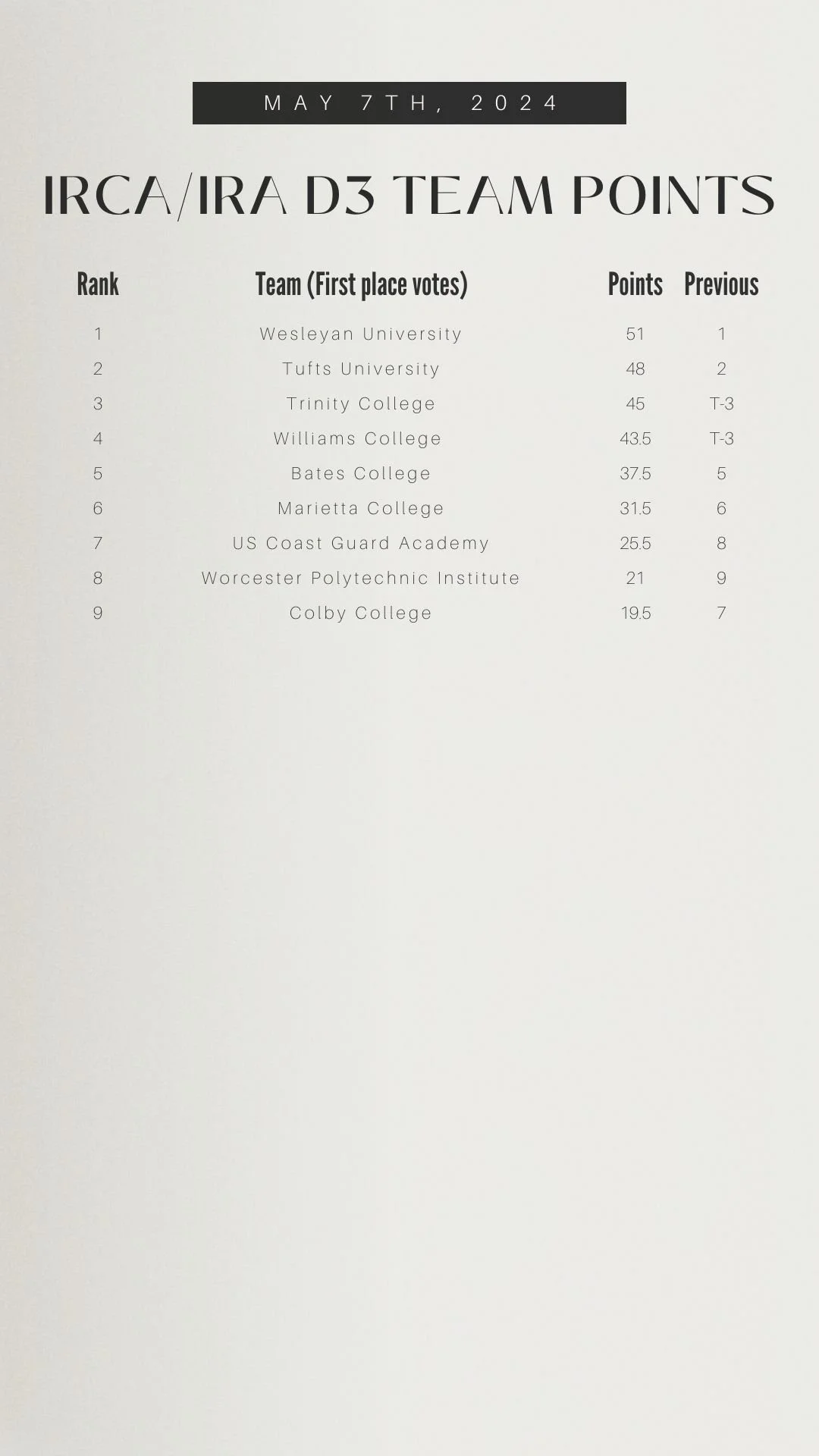 Today the Awards & Polling Committee released the 2024 Week 5 IRCA/IRA Coaches Poll, which ranks the Top 25 D1/D2 varsity 8+s, the Top 15 D3 varsity 8+s, and all varsity lightweight programs' top boat . The regular season poll will be released weekly on Wednesdays through the end of the season and can be found here under the “news” tab, on row2k, and on our Instagram. Past polls are saved as “highlights” on IG.
