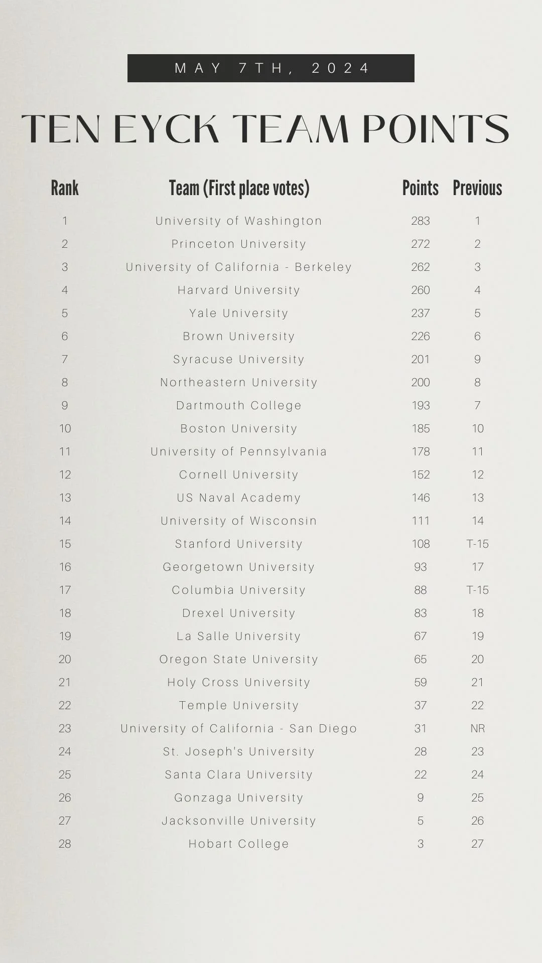 In addition to the varsity 8+ rankings for all divisions, polls this week also include rankings for the D1/D2 2nd and 3rd varsity 8+s, Ten Eyck team points, D3 2nd varsity 8+s, D3 team points, Lightweight 2nd varsity 8+s, and Lightweight team points.