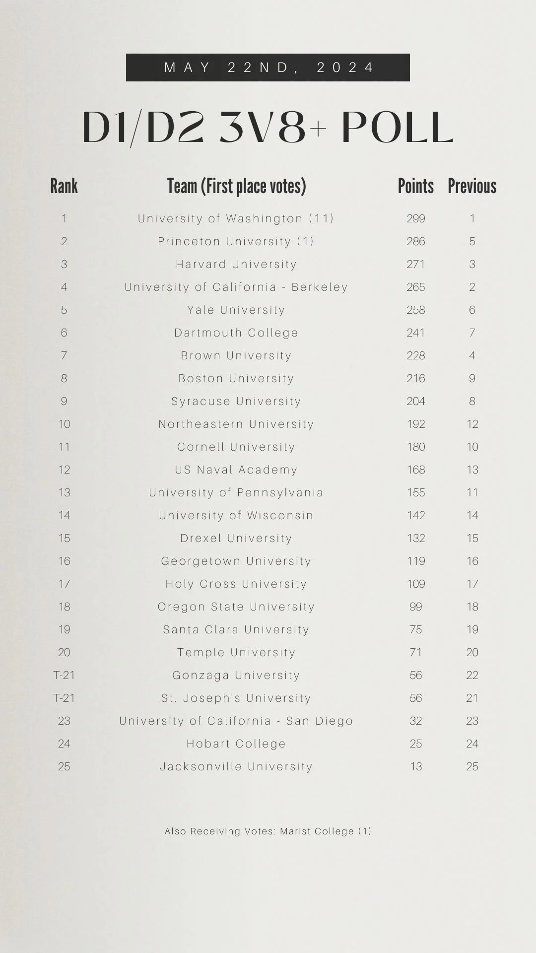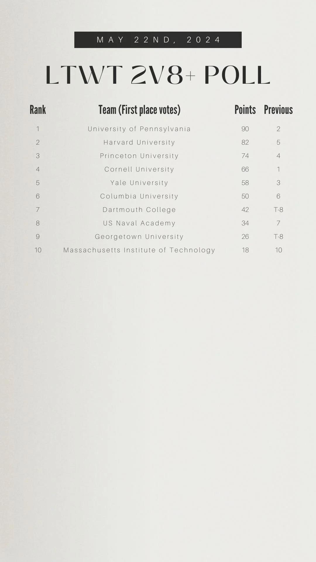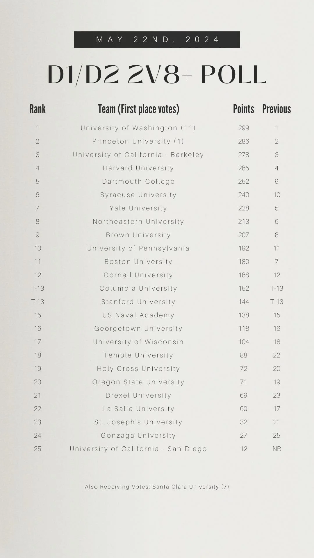 In addition to the varsity 8+ rankings for all divisions, polls this week also include rankings for the D1/D2 2nd and 3rd varsity 8+s, Ten Eyck team points, D3 2nd varsity 8+s, D3 team points, Lightweight 2nd varsity 8+s, and Lightweight team points.