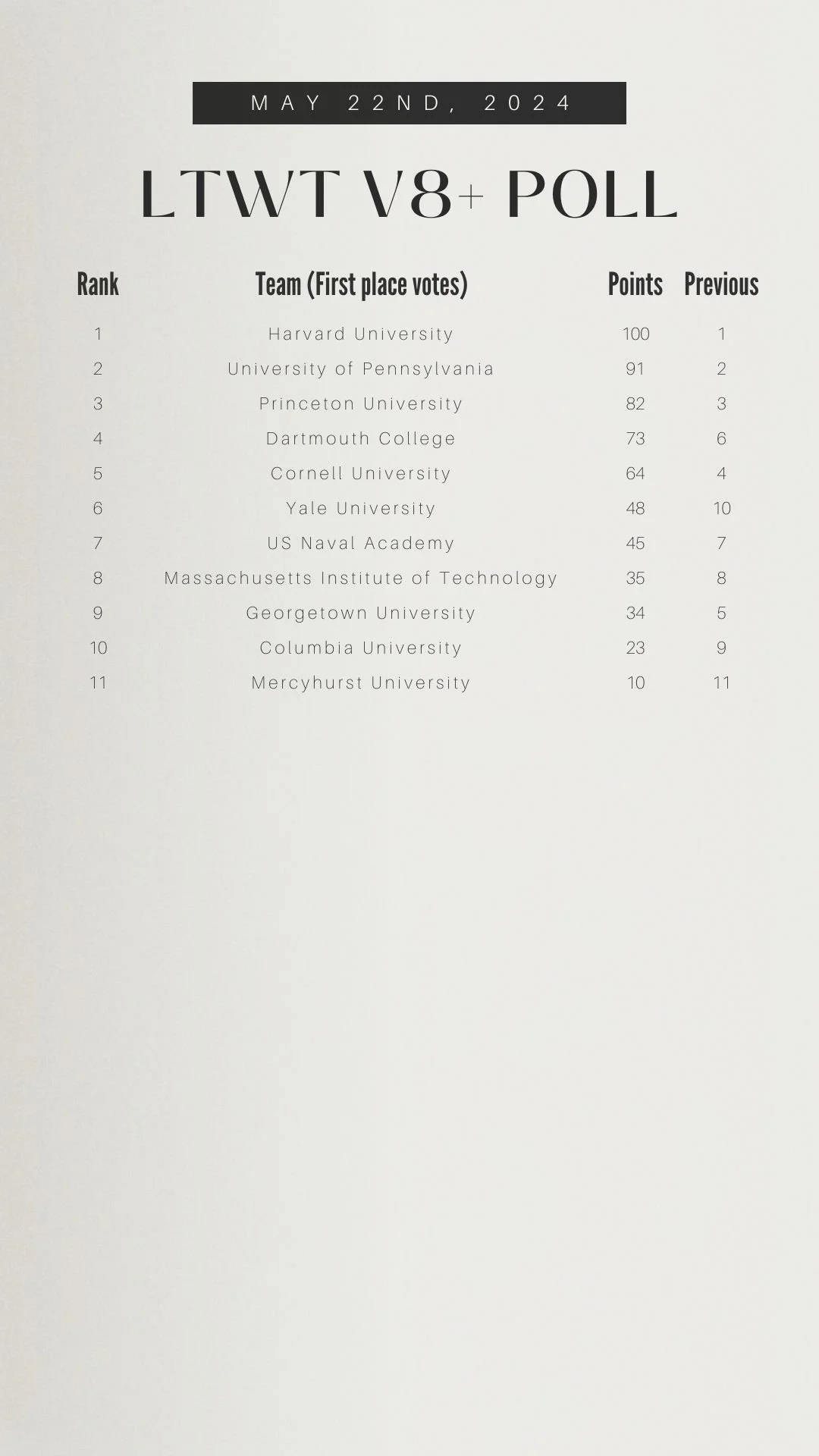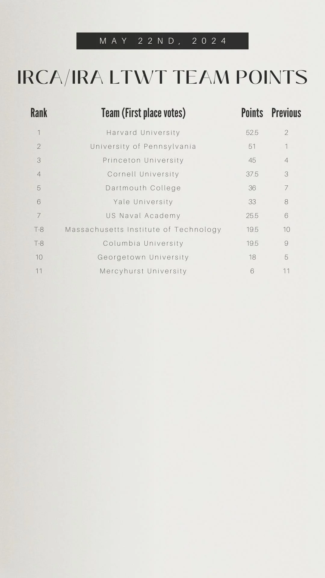 Today the Awards & Polling Committee released the 2024 Week 6 IRCA/IRA Coaches Poll, which ranks the Top 25 D1/D2 varsity 8+s, the Top 15 D3 varsity 8+s, and all varsity lightweight programs' top boat . The regular season poll will be released weekly on Wednesdays through the end of the season and can be found here under the “news” tab, on row2k, and on our Instagram. Past polls are saved as “highlights” on IG.