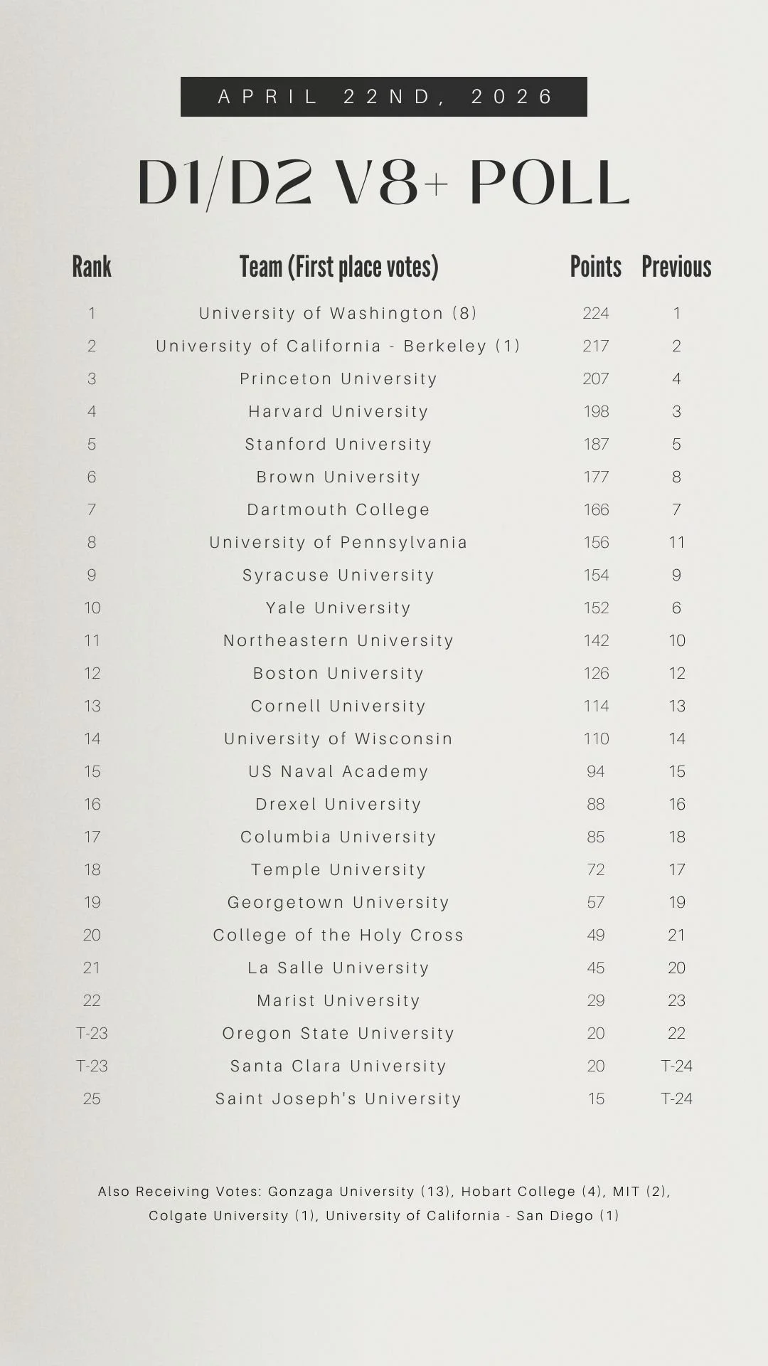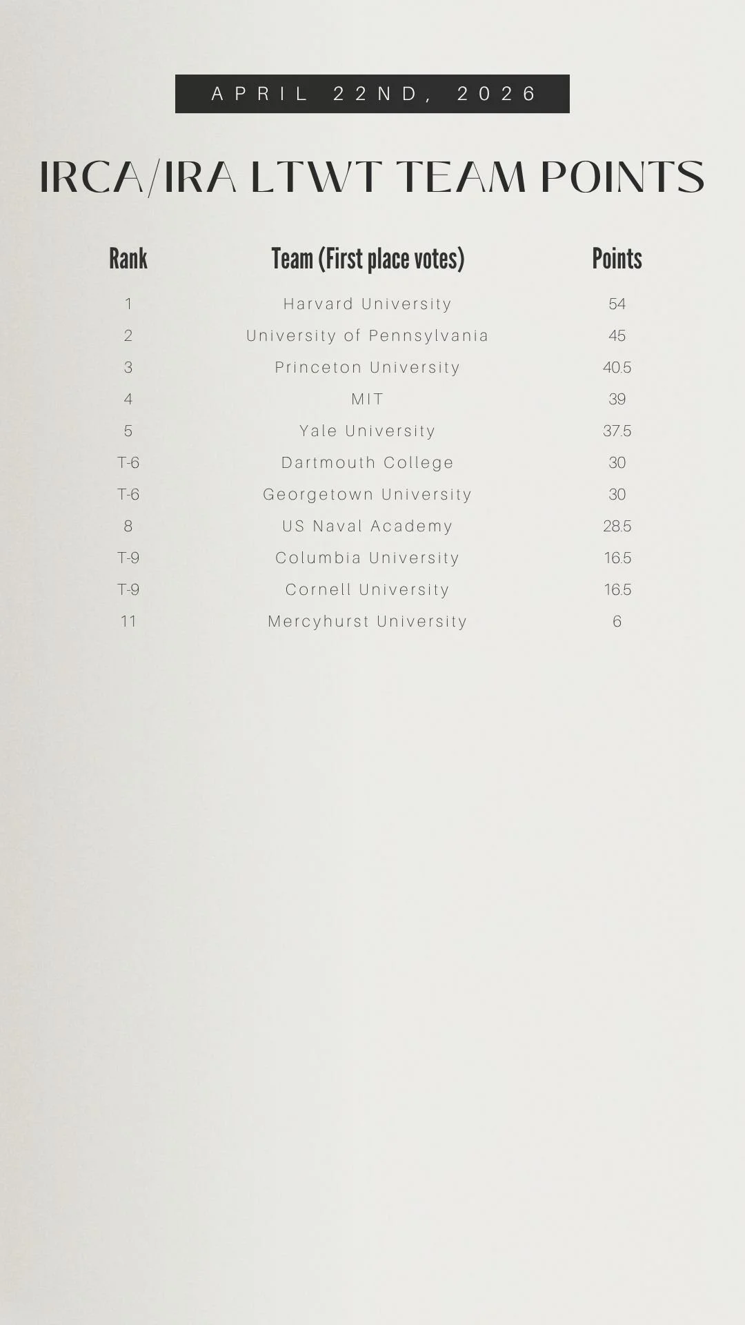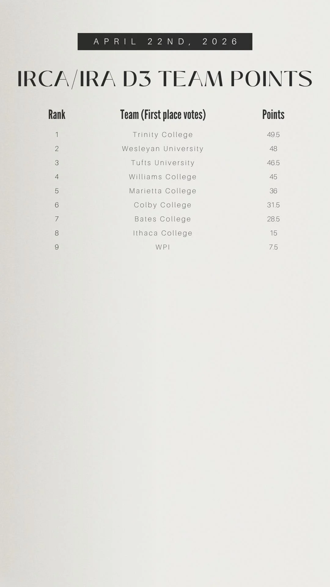 Today the Awards & Polling Committee released the 2026 Week 3 IRCA/IRA Coaches Poll, which ranks the Top 25 D1/D2 varsity 8+s, the Top 15 D3 varsity 8+s, and all varsity lightweight programs' top boat . The regular season poll will be released weekly on Wednesdays through the end of the season and can be found here under the “news” tab, on row2k, and on our Instagram. Past polls are saved as “highlights” on IG.