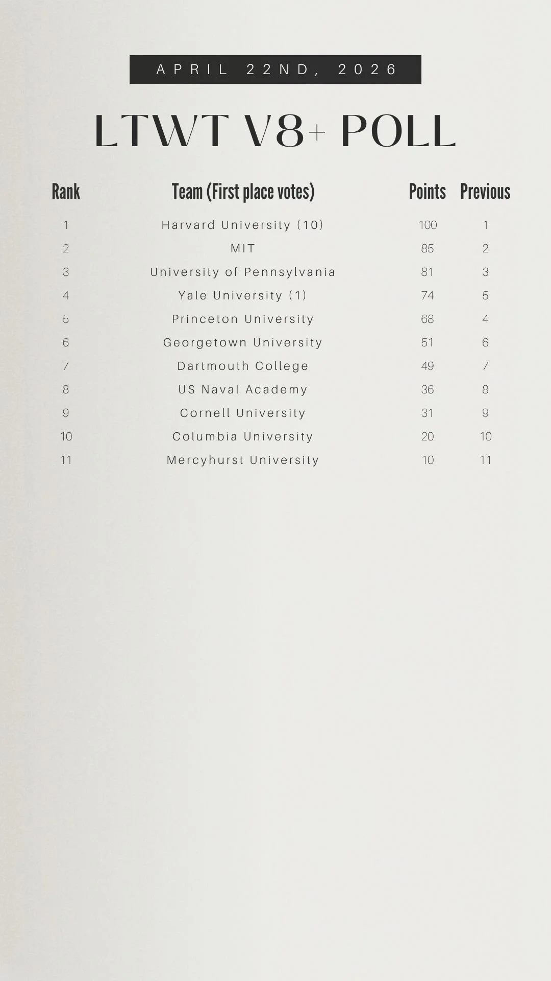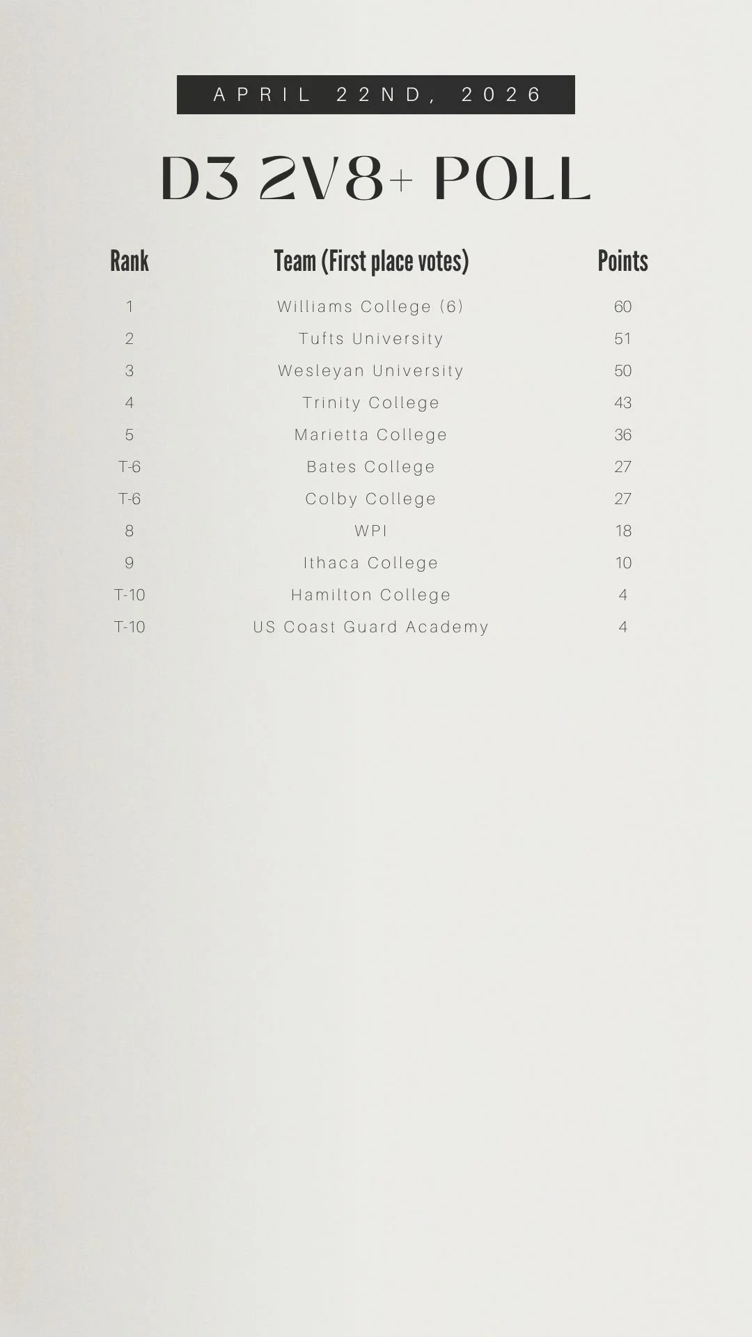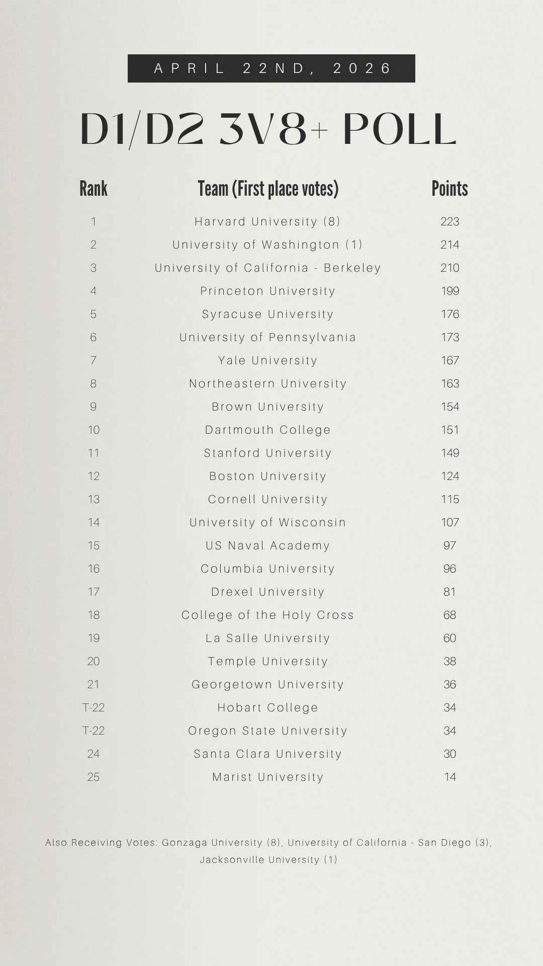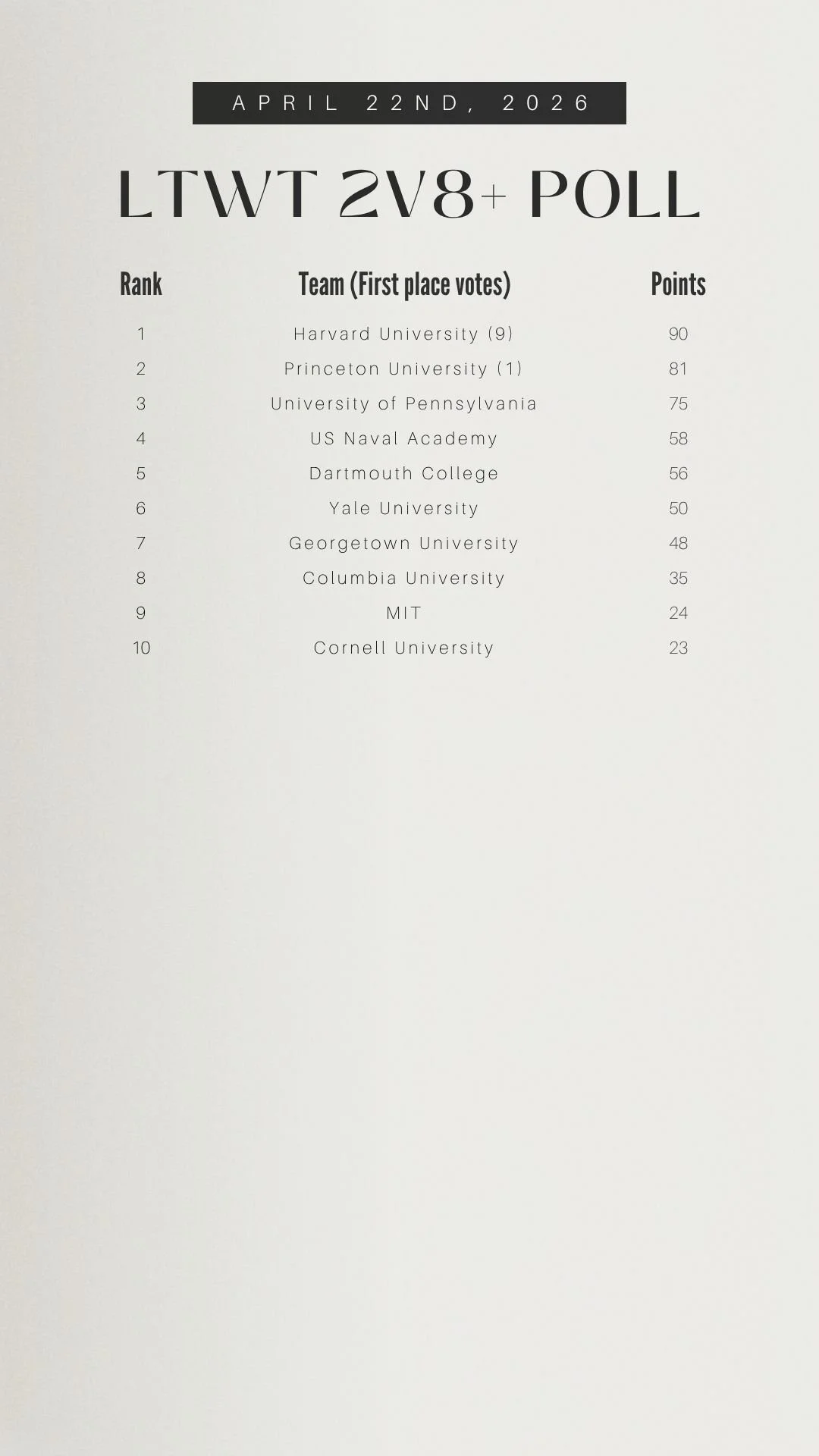 Today the Awards & Polling Committee released the 2026 Week 3 IRCA/IRA Coaches Poll, which ranks the Top 25 D1/D2 varsity 8+s, the Top 15 D3 varsity 8+s, and all varsity lightweight programs' top boat . The regular season poll will be released weekly on Wednesdays through the end of the season and can be found here under the “news” tab, on row2k, and on our Instagram. Past polls are saved as “highlights” on IG.