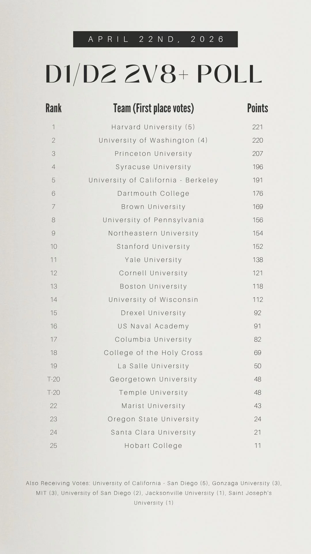In addition to the varsity 8+ rankings for all divisions, polls this week also include rankings for the D1/D2 2nd and 3rd varsity 8+s, Ten Eyck team points, D3 2nd varsity 8+s, D3 team points, Lightweight 2nd varsity 8+s, and Lightweight team points. Point allocations can be seen here.