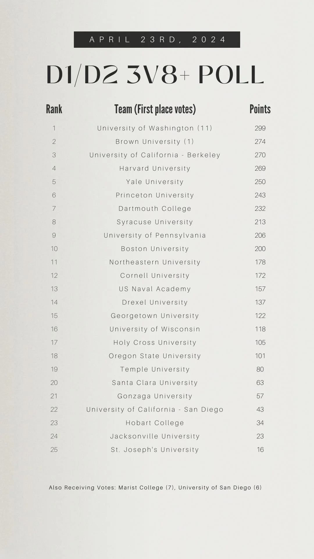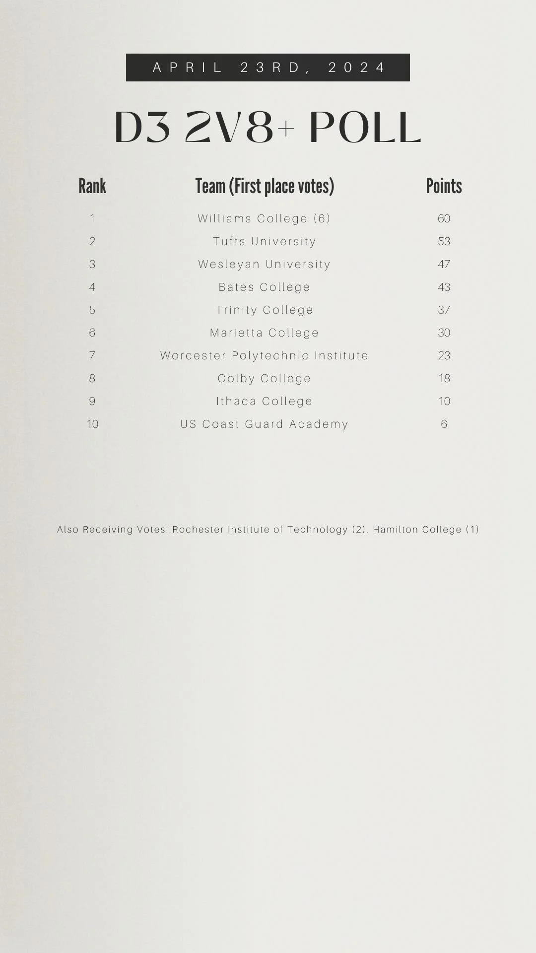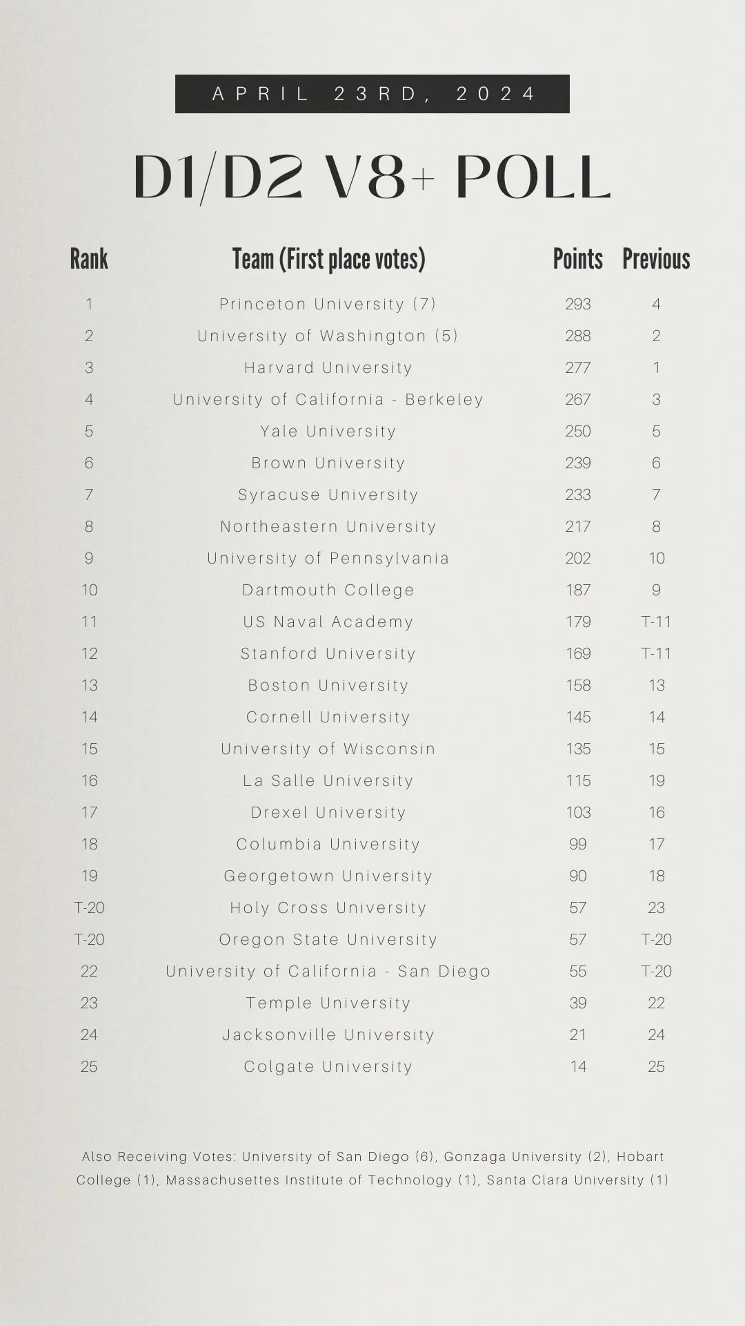 In addition to the varsity 8+ rankings for all divisions, polls this week also include rankings for the D1/D2 2nd and 3rd varsity 8+s, Ten Eyck team points, D3 2nd varsity 8+s, D3 team points, Lightweight 2nd varsity 8+s, and Lightweight team points.