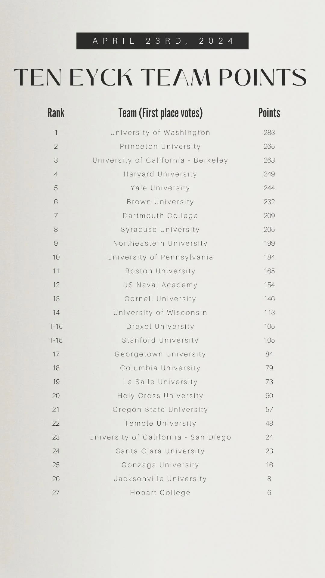 To determine the standings, the A&P committee has selected twelve D1/D2 pollsters, six D3 heavyweight pollsters, and eleven lightweight pollsters from across the nation, representing every region in Men's Collegiate Rowing, as well as all divisions.