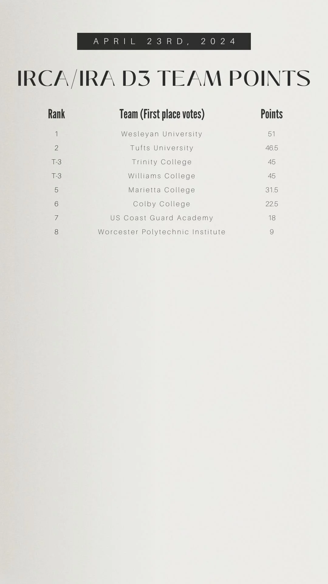 Today the Awards & Polling Committee released the 2024 Week 3 IRCA/IRA Coaches Poll, which ranks the Top 25 D1/D2 varsity 8+s, the Top 15 D3 varsity 8+s, and all varsity lightweight programs' top boat . The regular season poll will be released weekly on Wednesdays through the end of the season and can be found here under the “news” tab, on row2k, and on our Instagram. Past polls are saved as “highlights” on IG.