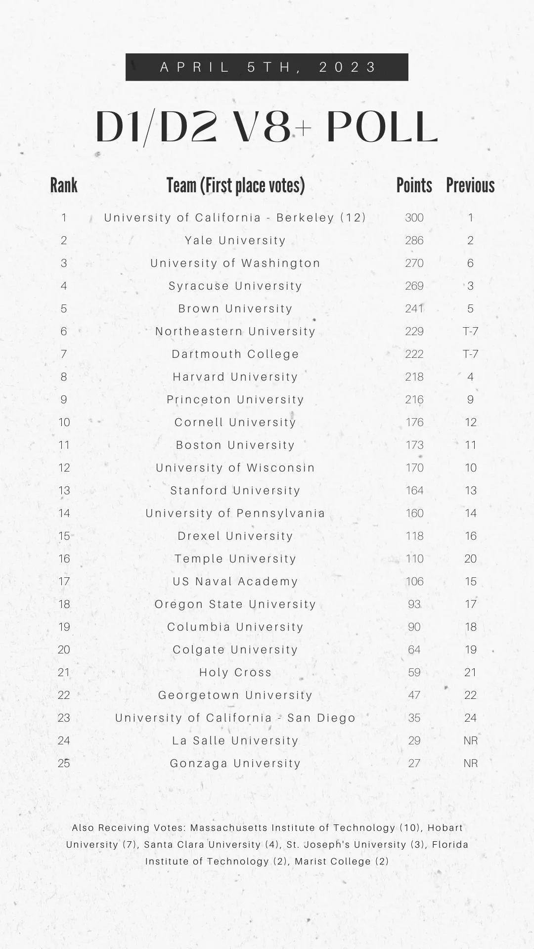To determine the standings, the A&P committee has selected twelve D1/D2 pollsters, six D3 heavyweight pollsters, and eleven lightweight pollsters from across the nation, representing every region in Men's Collegiate Rowing, as well as all divisions.
