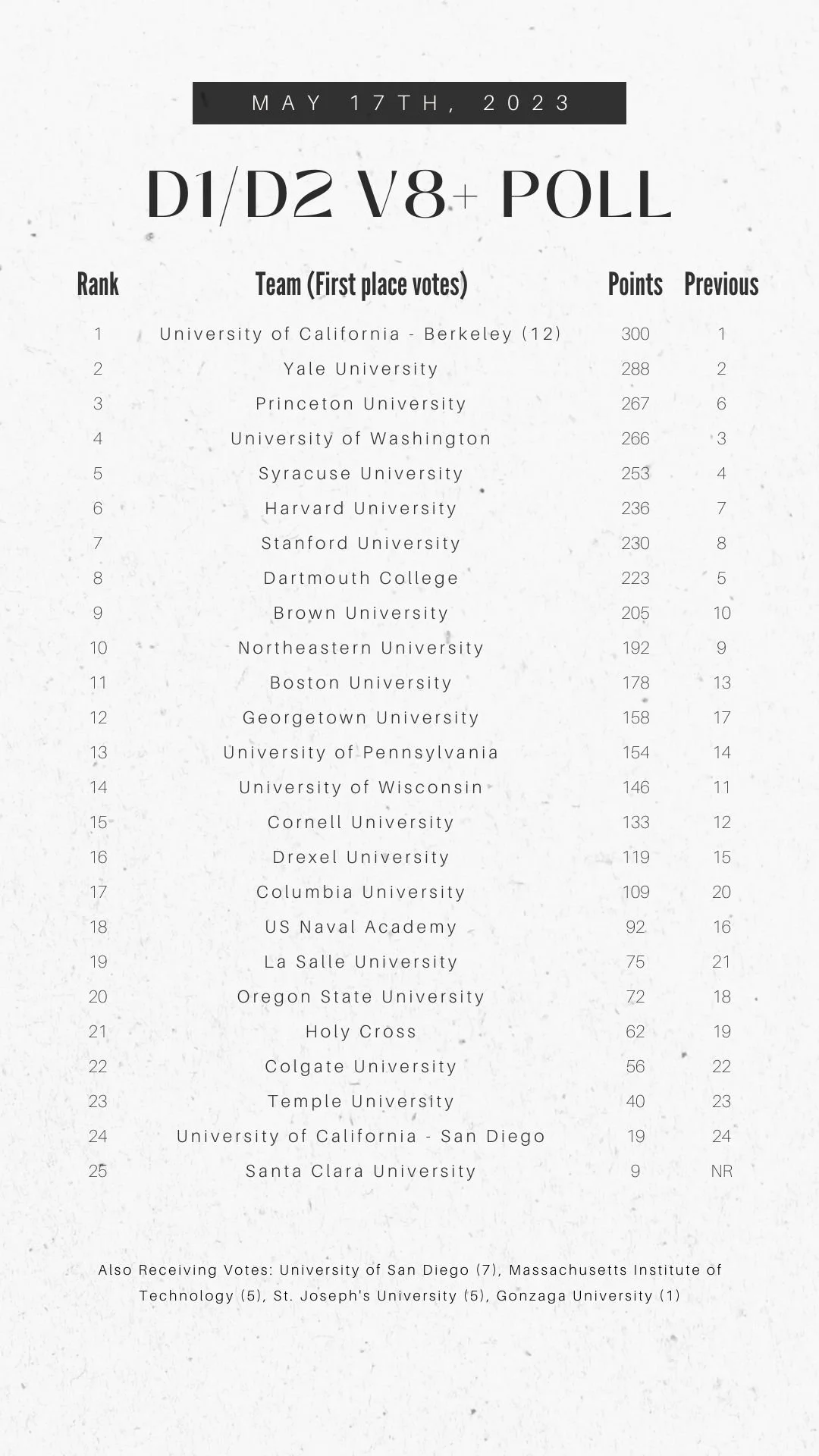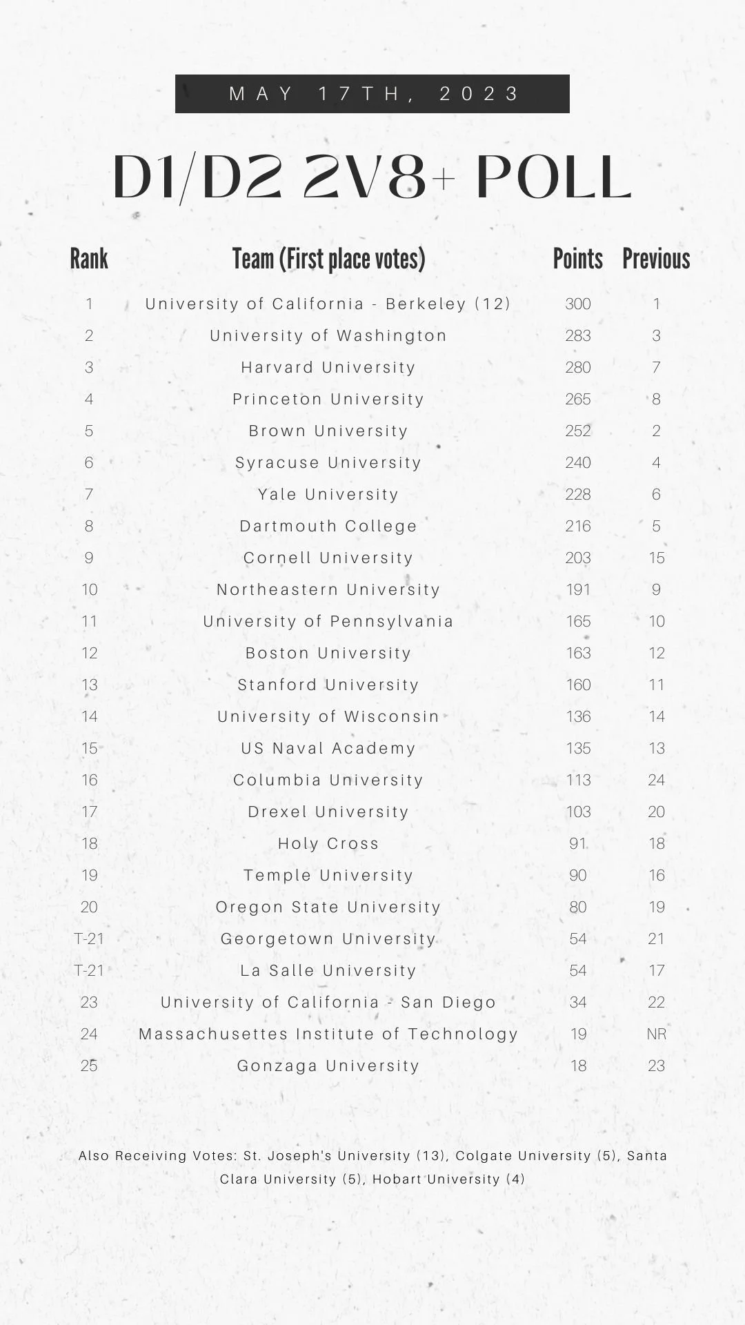 In addition to the varsity 8+ rankings for all divisions, polls this week also include rankings for the D1/D2 2nd and 3rd varsity 8+s, Ten Eyck team points, D3 2nd varsity 8+s, D3 team points, Lightweight 2nd varsity 8+s, and Lightweight team points.
