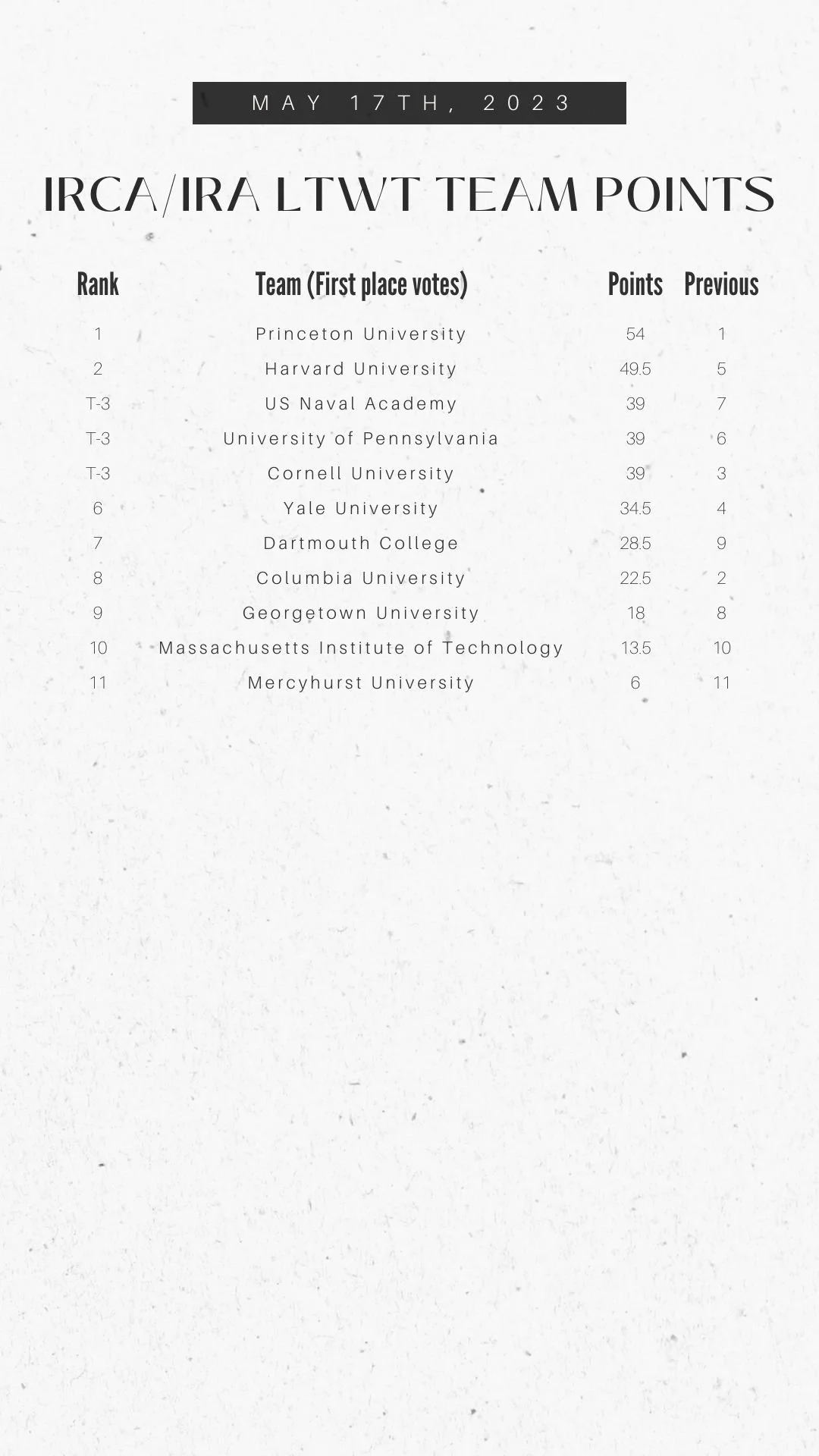 This morning the Awards & Polling Committee released their Week 6 IRCA/IRA Coaches Poll, which ranks the Top 25 D1/D2 varsity 8+s, the Top 15 D3 varsity 8+s, and all varsity lightweight programs' top boat . This will be the final poll of the 2023 season and serves as the seeding poll for selection to the IRA National Championships. Previous weekly polls can be found here under the “news” tab, on row2k, and on our Instagram. Past polls are saved as “highlights” on IG.