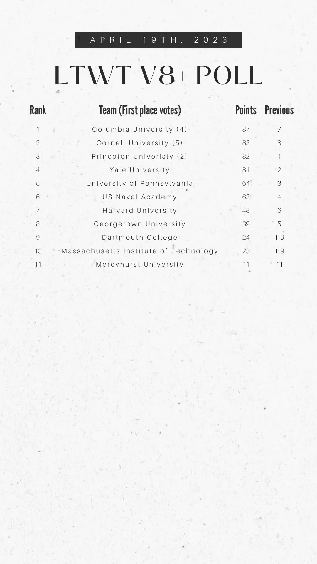 In addition to the varsity 8+ rankings for all divisions, polls this week also include rankings for the D1/D2 2nd and 3rd varsity 8+s, as well as Ten Eyck team points.
